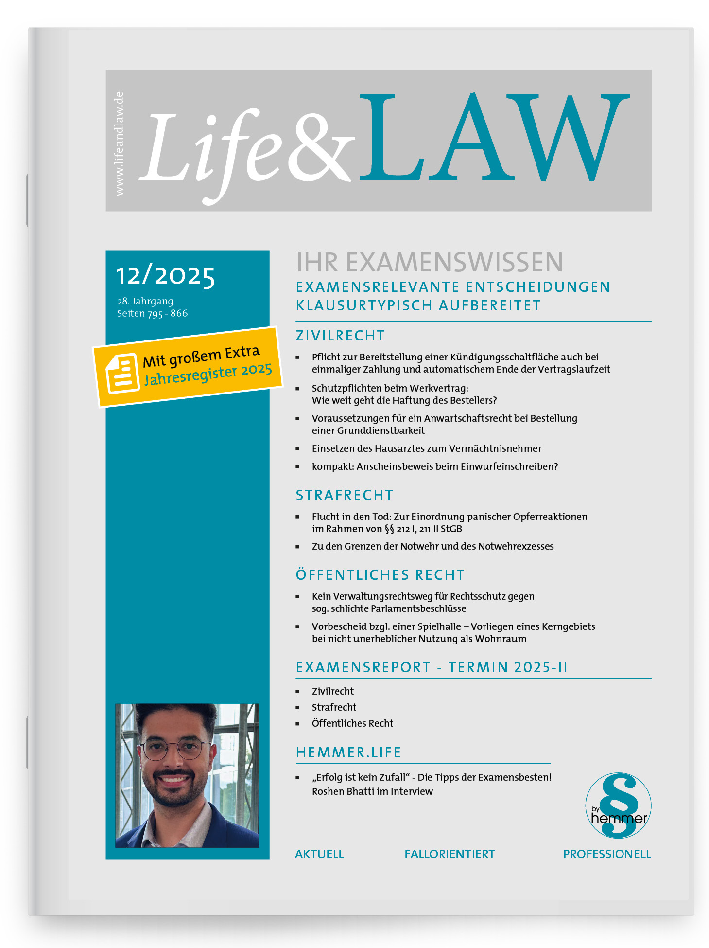 Die Life&LAW ist die deutschlandweit monatlich erscheinende hemmer-Ausbildungszeitschrift. In jeder Ausgabe werden aktuelle Entscheidungen im Bereich des Zivil-, Straf- und Öffentlichen Rechts aufbereitet und klausurtypisch gelöst.