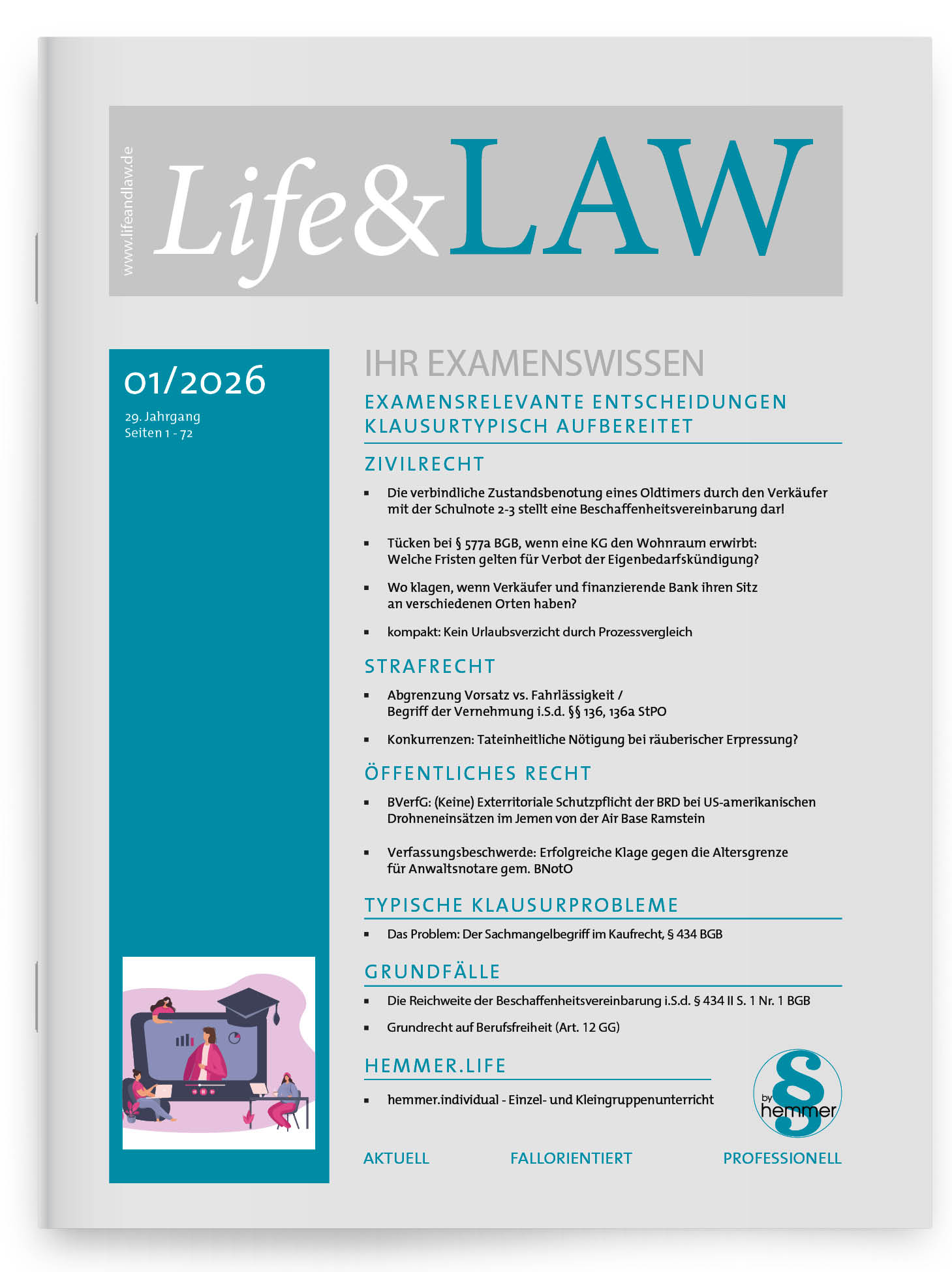 Die Life&LAW dient in erster Linie als Schulungsmittel, indem sie aktuelle Rechtsprechung für Studierende, Referendarinnen und Referendare examenstypisch aufbereitet. Weiterhin werden die Leserinnen und Leser im hemmer.life Magazin über Interessantes rund um die Juristerei informiert. Zusätzlich ist die Zeitschrift für alle Juristinnen und Juristen ein wichtiges Nachschlagewerk für aktuelle Entscheidungen.